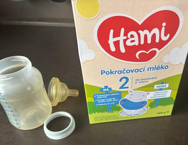 V balíčku přišla jedna krabice mléka Hami. Akorát nám to vyšlo, že jsme dodělávali posledních pár porcí našeho mléka, a tak jsme plynule přešli na testování.