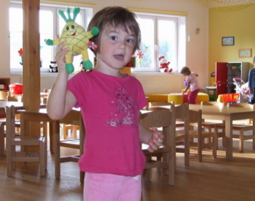 Program má Elli s mladou učitelkou - od 8 hodin svačinku, tancování a cvičení, angličtinu, volné hraní, malování, venčení, oběd a ve 12 hodin chodí domů. Se starší mají místo angličtiny říkanky, písničky a básničky, minimálně 2x měsíčně mají dopoledne divadlo.