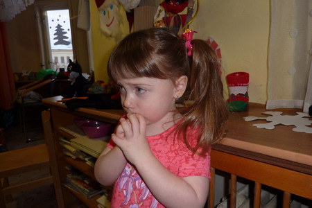 Třída Koťátek měla za úkol v den Mikulášské nadílky přijít oblečená do bílého - jako andílci. To se ovšem naší Haničce hrubě nelíbilo. A to jsem si od kamarádky vypůjčila krásné bílé šatičky, ve školce si Hanička s pomocí paní učitelky vyrobila čelenku se zlatou hvězdou a ona přesto trvala na tom, že za andílka jít nechce. Nakonec se všechno vyřešilo tím, že se Kubík ráno probudil s vysokou teplotou a tak děti do školky nešly.