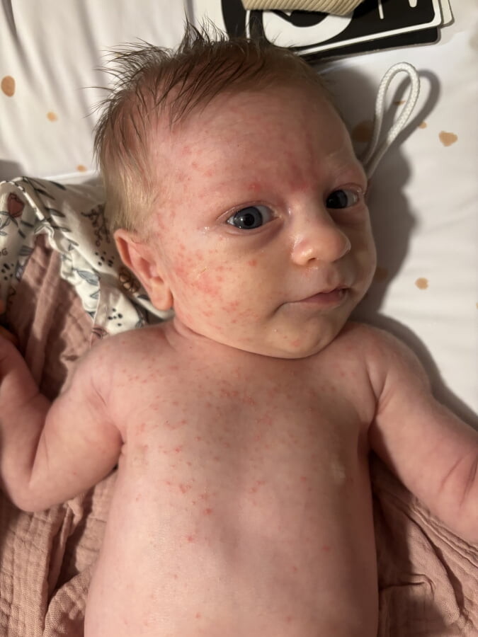 ráda bych se poradila, jestli takováto vyrážka může být příznakem ABKM. Dceři se objevila ve třech týdnech, nejdříve lehce ve vlasech, postupně se vysévala přes obličej na hrudník a záda. Kromě lehkého nadýmání, které má téměř od narození a nevidím v něm nic závažného, jiné příznaky nemá. Nejsem si jistá, jak rychle se vyrážka projevuje – cca dva dny před prvním výskytem jsme nasadili umělou výživu Infatrini na dokrm ke kojení kvůli neprospívání a dalo by se říct, že vyrážka začala slábnout asi 2 dny po vysazení dokrmu, vyskytovala se cca týden. Nástup však nebyl nějaký rychlý ani patrný, jak bych si u alergické reakce představovala při přímé konzumaci kravského mléka. Dalším aspektem je, že již od porodu každý den konzumuji jogurty a sýry, mléku např. v potravinách se úplně striktně nevyhýbám, ale vynechávala jsem vyloženě přímou konzumaci mléka, smetany, másla apod. V posledních dvou dnech jsem zkusila přidat více mléka – trochu smetany v omáčce nebo více mléka v kávě a zejména na čele se vyrážka opět zhoršila. Může to mít prosím souvislost, nebo je to např. novorozenecké akné a proměnlivý výskyt je běžný? Děkuji předem za odpověď.