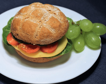 Žitná bulka s tvrdým sýrem, salátem, rajčetem a hrozny