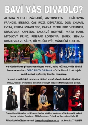 Známý dětský pěvecký sbor Coro Piccolo přijímá nové děti. Máte doma, nebo ve svém okolí, pěvecky, herecky a pohybově nadané dítě? Přiveďte ho do dětského pěveckého sboru Coro Piccolo. Na zkouškách sboru se děti kromě pěvecké techniky a hudební teorie učí herectví, jevištní mluvu, mají pohybovou výchovu a hrají nejrůznější improvizační hry. Díky herecké průpravě a odbornému hlasovému vedení jsou děti s úspěchem obsazovány do dětských divadelních rolí, natáčí pro televizi i rozhlas, dabují. Členové sboru působí v muzikálu i v činohře. Vidět je můžete v Hudebním divadle Karlín, v divadle Broadway, Hybernia, nebo například v Divadle pod Palmovkou či ve Studiu DVA. Sbor pořádá svá vlastní koncertní i divadelní představení, spolupracuje s dalšími hudebníky a hudebními tělesy Děti zpívají klasiku, pop, jazz i rock. Vystupují v koncertních síních, ve sportovních halách i na open air koncertech.