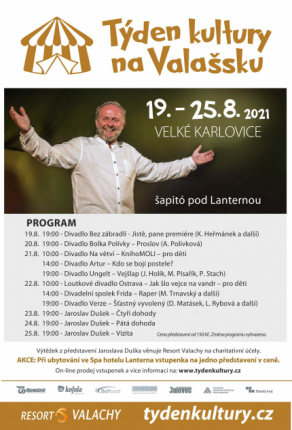 Po roční pauze se letos o prázdninách opět uskuteční charitativní divadelní festival Týden kultury na Valašsku. Cirkusové šapitó, v němž se odehraje celkem 11 představení, vyroste tradičně na louce pod Spa hotelem Lanterna. Výtěžek z akce věnuje pořádající Resort Valachy opět na dobročinné účely. Těšte se na legendární inscenace předních českých divadel, známé herecké osobnosti i představení pro děti. A pozor: hosté ubytovaní ve Spa hotelu Lanterna mají v ceně pobytu 1 vstupenku na 1 noc a 1 pokoj.