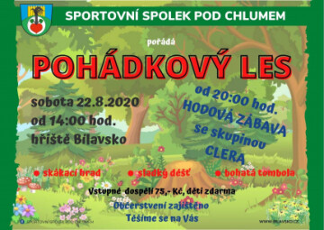 Sportovní spolek Pod Chlumem pořádá POHÁDKOVÝ LES, který se uskuteční v sobotu 22. srpna 2020 od 14 hodin na hřišti v Bílavsku.Na lesní trase, kterou zvládnou i menší děti, na vás i vaše děti budou če...