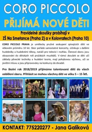 Známý dětský pěvecký sbor Coro Piccolo přijímá nové děti. Máte doma, nebo ve svém okolí, pěvecky, herecky a pohybově nadané dítě? Přiveďte ho do dětského pěveckého sboru Coro Piccolo. Na zkouškách...