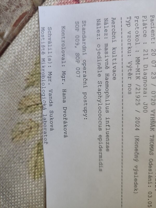 Dobrý den syn skoro měsíc má hnisavou rýmu plus kašel Měl na to antibiotika amoksiklavTo mu ale vůbec nezabraloTak naše Dr nechala udělat stěry a vyšlo viz fotoMasivně haemophilus influenzaePoslala nás tedy na ORL a tam že mu nic vlastně není a na tu hnisavou rýmu nám napsali Nasonex a máme za 6 týdnů dojed má kontrolu a že je to úplně běžný nález Když jsem to ale hledala na internetu,tak mi vyjelo že se na to musí brát antibiotika a musí se to léčit Tak se chci zeptat jak to tedy je a zda je syn nakažlivý , protože na ORL mi vlastně neřekli nic a ještě jsme tam byli za blbce,že co tam vlastně děláme Předem moc děkuji za odpověď