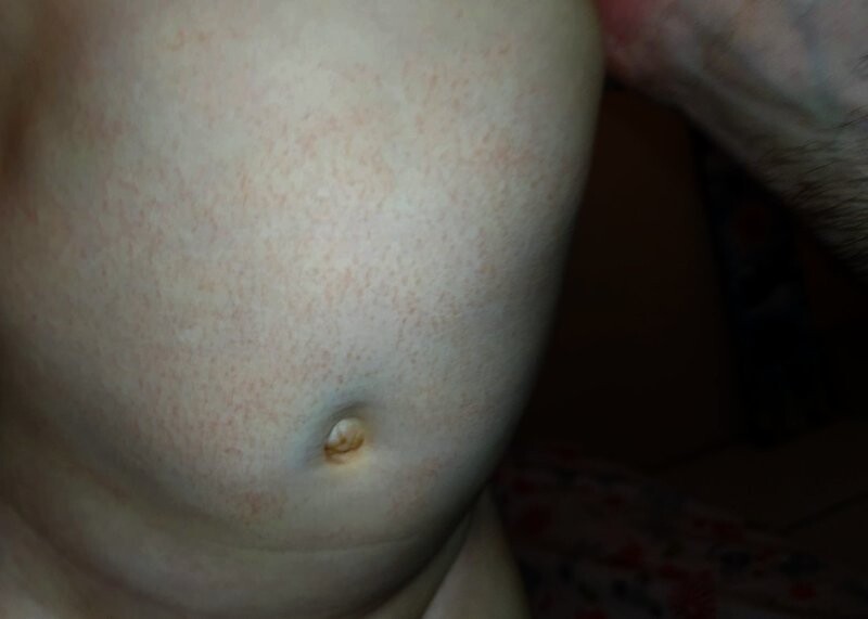 Dobrý denSyn 15 měsíců prodělal horečku 39°C dva dny, po týdnu zvracel obloukem asi 36 hodin a měl průjem. Byl značně dehydratován, plenka byla dva dny téměř suchá (ale měl ty průjmy), kojení nakonec celkem zachraňovalo.Nicméně.Po zlepšení situace se mu objevili podivné drobné vyrážky (možná takové červené čárky) na břiše kolem pupíku a trochu i na stehnech (viz foto). Velké fleky na fotkách už měl a ty jsou zřejmě ekzem. Je plačtivější, něco ho bolí v pusince, ale to budou zuby. Možná chytá rýmu, divně polyká.Nedokážete takto na dálku identifikovat podle fotografie, co by mohli ty "vyrážky" být? Jsou více zřetelné po koupeli (ale nekoupeme nějak více teplou vodou). Nemohou souviset s předešlou výše popsanou nemocí?Děkuji