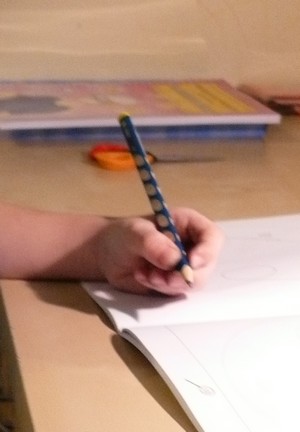 Moc chválím Haničku za lepší držení tužky. Jen pozor na ten odklon od těla. U leváků je to trošku problém. Nikdy jim nebude směřovat konec tužky přesně k rameni. Je ale důležité Haničku na to upozorňovat, protože odklon by byl stále větší a následně pak tužka otočená dopředu.