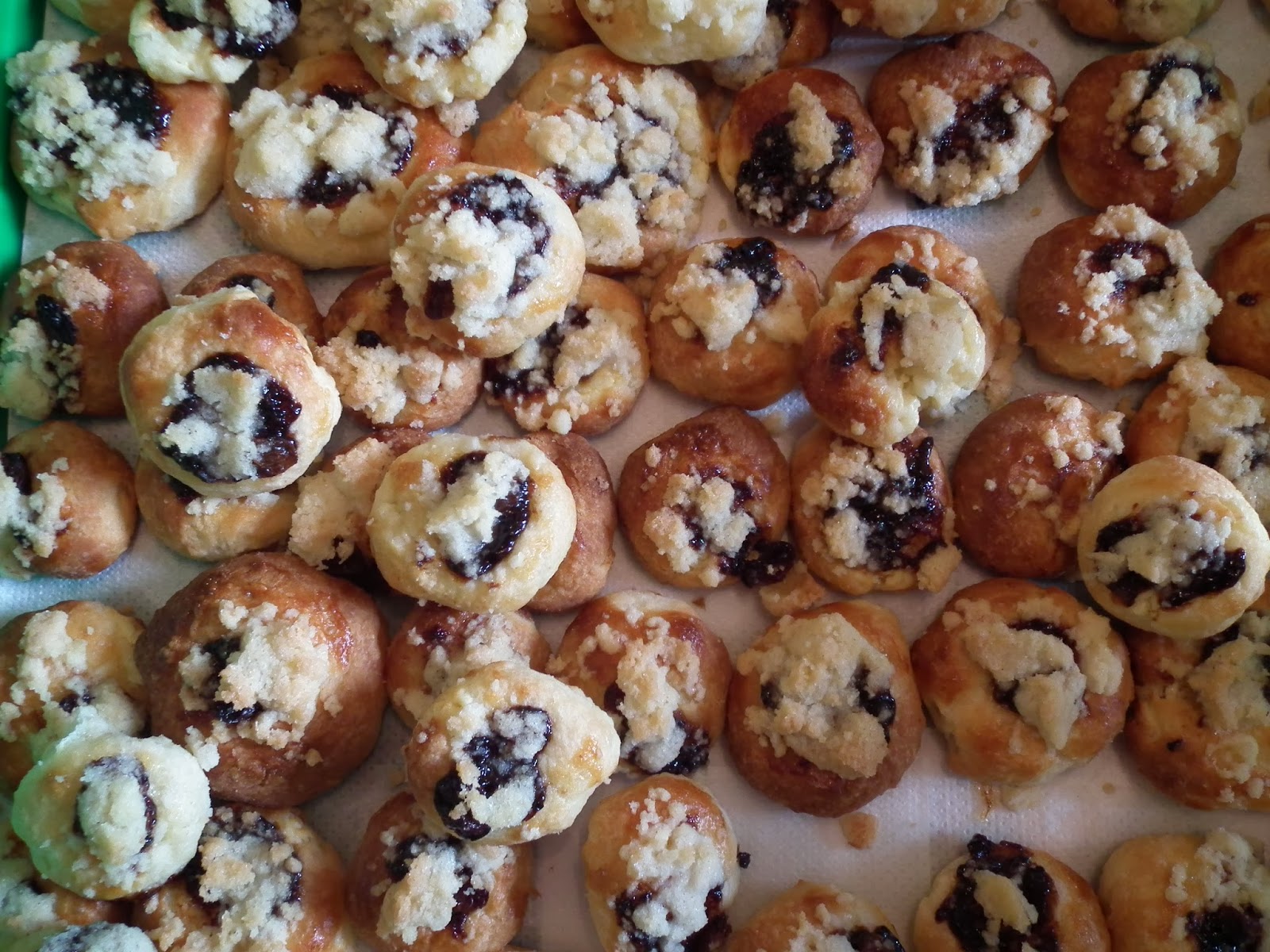 . Jinak má ráda moravské koláče, které jsem se naučila od mé babičky z Mohelnice, a na které přikládám recept:Moravské koláčetěsto:1/2 kila pol. moukyšpetka soli10 dkg cukru2 žloutky7 lžic oleje2 droždí1/4 mléka1 x 100% tuk2 tvarohdrobenkapovidlarozinkyZadělám z mléka a droždí kvásek, který přidám do ostatních surovin a nechám v robotu zadělat těsto.Když je hotové tak na pomoučeném stole vyválím placku, na kterou na jemném struhadle nastrouhám 100% tuk, pak překládám jako listové těsto, které znovu 2 x vyválím a zase 2 x složím a pak vyválené těsto rozkrájím na malé čtverečky rádélkem. Na čtverečky dávám vyšlehaný tvaroh z cukrem a žloutky ( já dávám ještě trošku rumu