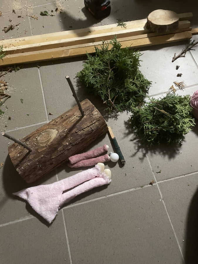 Začneme vyrábět skřítka. K prvnímu klacíku přiváže nohy, pomocí vázacího drátu. Poté postupně přivazujeme větvičky, jednu až dvě řady podle hustoty.