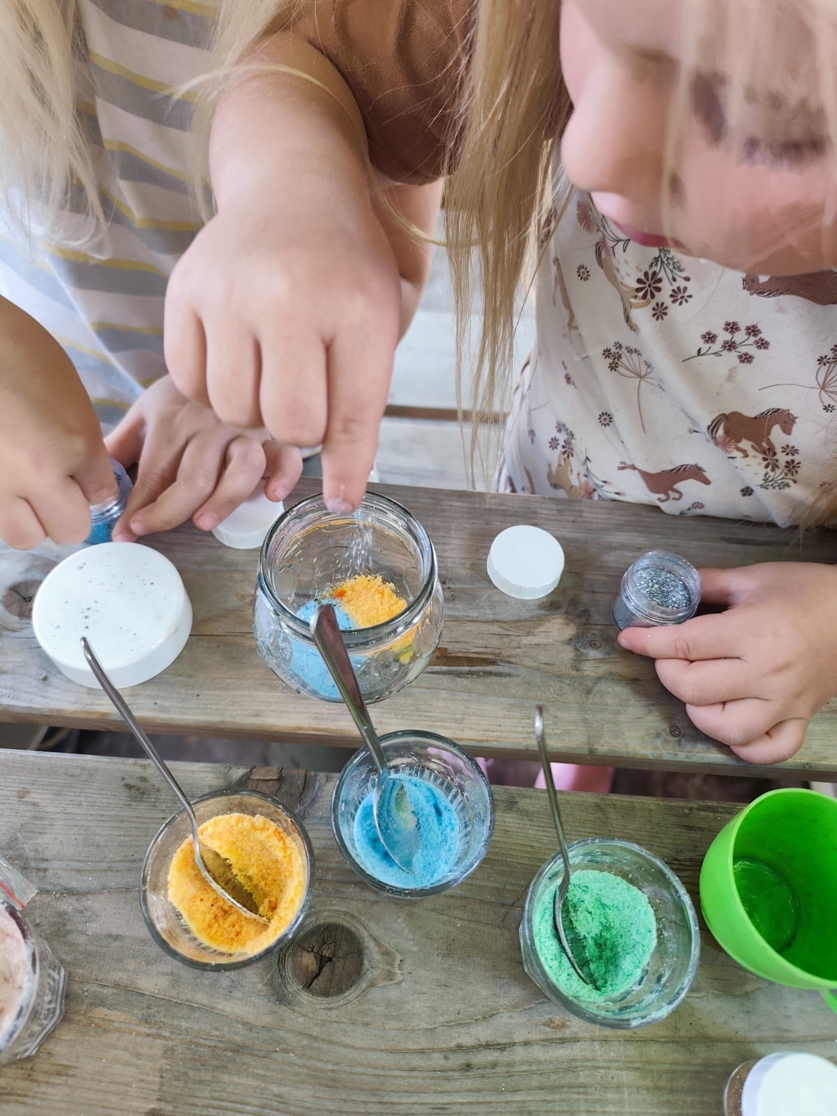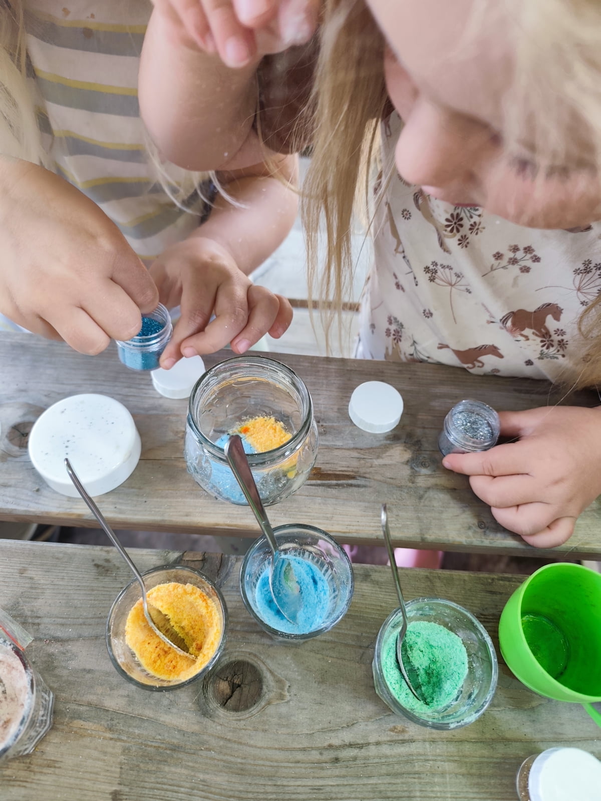 Já jsem používala na obarvení sody gelové jedlé barvy. Osobně bych příště zvolila spíše práškové. Barva se do jedlé sody opravdu špatně vmíchala. Z nějakého jiného tvoření jsme doma měli různé barvy třpytek a tak jsem je využila jako další část kouzelného lektvaru.