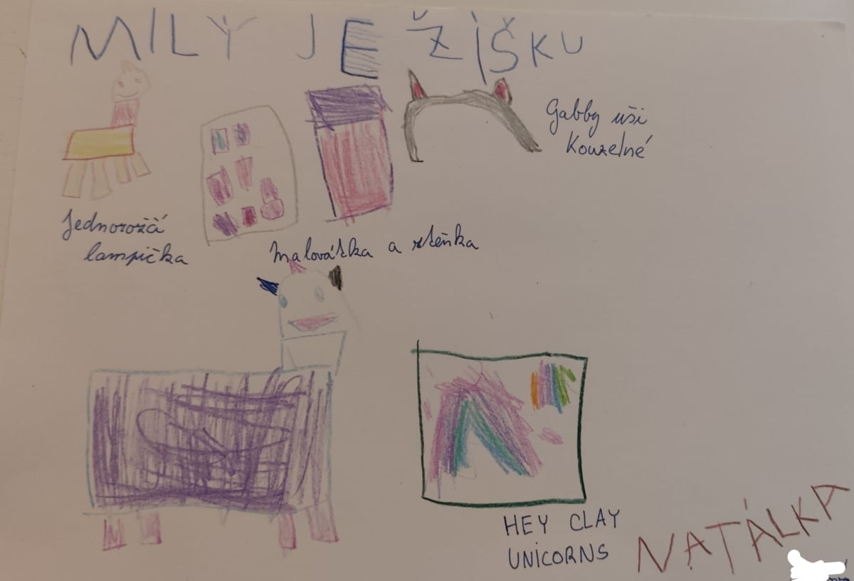 MILY JEŽÍŠKU na papír a ona ho opsala do dopisu. Tohle ji totiž baví a já ji učím aby se hlavně učila správně. Všechna písmena psát od horní části a nevadí když nebudou dokonalá. Má ještě stále 2 roky než půjde do školy. Podepsat už se zvládne sama. Požádala mě abych ke každému obrázku radši napsala co to je.