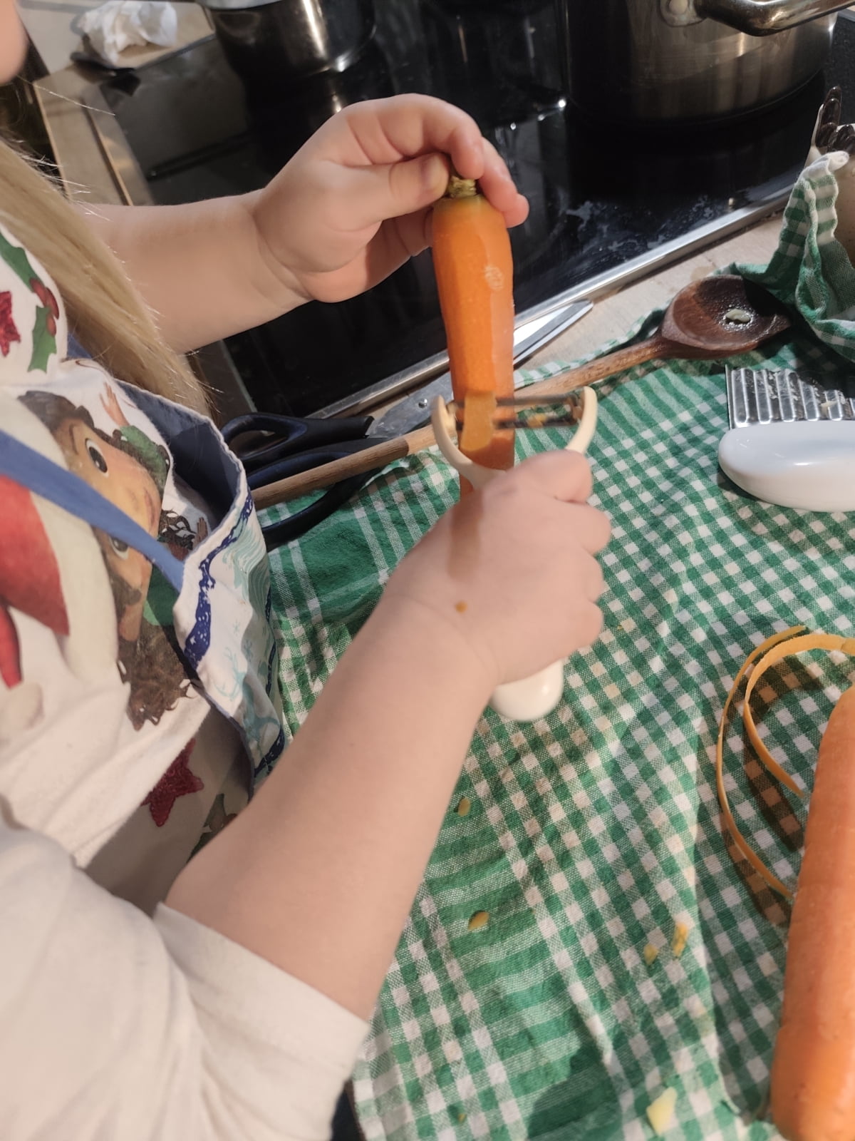 Když má manžel odpolední tak je u nás dámská jízda. V ten moment každý den vaříme teplé večeře. Holky mi pomáhají loupat mrkev, krájet pečivo nebo umývat ovoce a zeleninu. Občas míchají maso na pánvičce nebo vysypou těstoviny do vody.