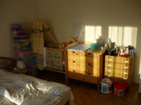 Miky.81 nám napsala, že umístění přebalováku rozhodli dle toho, kde bude malá spinkat, aby ji Hanka nemusela nosit v noci před kojením přes celý byt, ale jen vyndat z postýlky, přebalit, nakojit a pokud možno u toho moc nesvítit. Mají tedy přebalovací koutek hned vedle postýlky v ložnici, která je situována vedle koupelny. „Koupili jsme pouze podložku, kterou umístili na stávající komodu z obývákové stěny bývalého bytu.“
