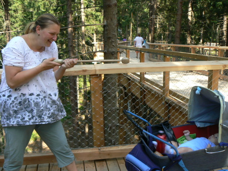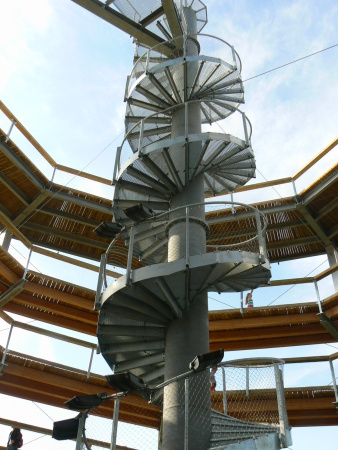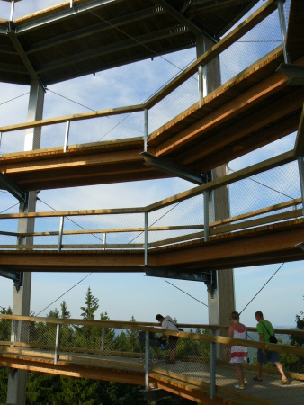 Nicméně stezka pokračovala ještě výš. Drandili jsme s kočárkem a moc se těšili na ochoz, ze kterého bude výhled kolem dokola. (Jedna malá výtka stavitelům – píší zde, že je to bezbariérové, ale v posledním patře rozhledy jsou schody, nevím, jak by se tam vozíčkář dostal.)
