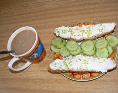 | 1764kJ | 6:30 | tmavý celozrnný rohlík 1 ks, gervais sýr, paprika 40 g, 3v1 |