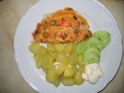 Plátky Pangásia máslo koření na ryby nebo provensálské koření olivový olej cibule rajčata, sušená rajčata, paprika, olivy, kukuřice,... sýr vajíčka Na pečící papír jsem do zapékací misky dala do trouby plátek pangasia posypaný kořením a pokladený plátky másla. Ty jsem nechala upíct, cca 15 minut. Mezi tím jsem si připravila věci na čepici. Na olivovém oleji jsem osmahla na čtvrt kolečky nakrájenou cibuli, jak normální tak červenou. Pak jsme tam dala podusit na nudličky papriku a rajčata. Dávám tam vždycky to co mám doma, když něco chybí nevadí. Místo čerstvých rajčat dám občas sušené, místo papriky jsme teď dala olivy a podobně. Trochu osolit a dát koření co kdo má rád. Já dala jen provensálskou směs a drcený kmín.Všechno jsme to podusila, nakonec jsme tam dala nakrájený sýr na kostky a vajíčko. Všechno jsme zamíchala a nechala vajíčko srazit. Celou směs jsem dala na upečenou rybu a nechala zapéct. Dělal jsem jen pro sebe, byli to dvě malé porce a rybu měl i Ondra. Tím jsem to moc nekořenila a ani nesolila.