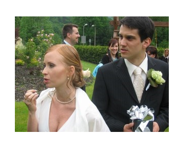 Byla jsem nevyspalá, opuchlá a doslova odevzdaná všemu, co ještě přijde. Účes se nakonec vydařil, v pronajatém bytě jsem místo několika přátel zůstala jen s kámoškou sama a nebylo tedy z příprav ani moc co fotit, ženichův otec, co mě měl vyzvedávat, přijel pozdě, k vizážistce vedla pěší zóna, kde nás tedy zastavili policisté a já, nevěsta, jsem musela popadnout boty a šaty a běžet po svých, zatím co kámoška s řidičem upalovali zpět na byt, protože jsme tam nechali mou kytici. Nutno dodat, že už v tento okamžik bylo cca 10 minut před časem obřadu. Ženich a zbytek procesí už nervózně přešlapovali před kostelem a mě se snažila „splasknout“ vizážistka, pak jsem se soukala do šatů a nakonec jsem načesaná, nalíčená, v šatech běžela centrem Brna na nádraží ke Grandu, kde na mě čekal řidič nastrojeného auta, aby mě popovezl o půl kilometru dál před kostel. O hodinu a nějaké drobné později jsem byla konečně před kostelem, vysmátá sledem všech událostí. Pohled na doslova nervozitou bílého ženicha byl jen třešničkou na dortu. Pak už jsem se prostě jen smála - nic jiného mi totiž nezbylo.
