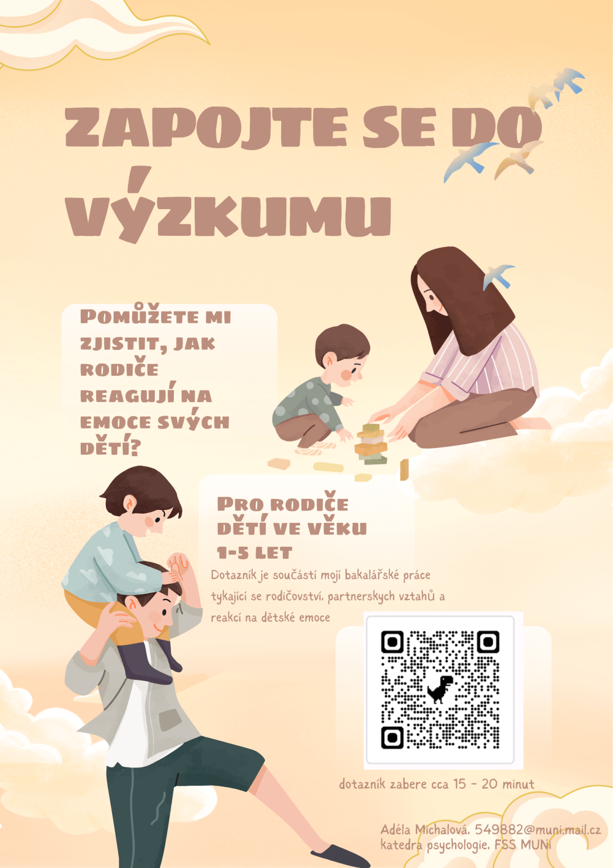 Dobrý den,jmenuji se Adéla Michalová a studuji psychologii na FSS MU. Ráda bych Vás požádala o vyplnění dotazníku pro svou bakalářskou práci, který se zaměřuje na rodičovství, partnerské vztahy a práci s emocemi u dětí ve věku 1–5 let. Vyplnění trvá cca 15–20 minut a je zcela dobrovolné a anonymní.