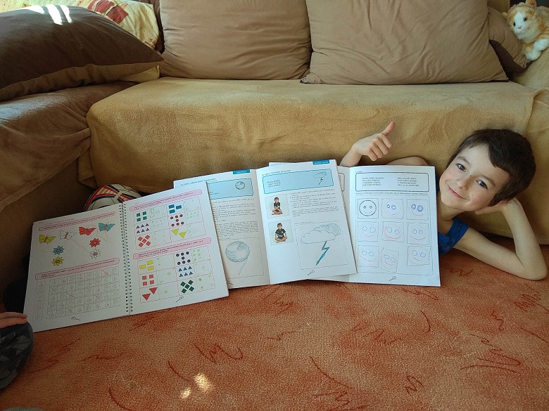 Nejraději má Hlavičkové úkoly, ty jsme dělali zhruba od 20. do 24. týdne a vesměs ho bavilo všechno, až na skládání geometrických tvarů, které vyžaduje spoustu trpělivosti, protože stačí, aby trochu zafuněl a všechny geometrické tvary se mu rozletí. Tak u toho se zlobil, ale jinak ho z Hlavičkových úkolů všechno moc baví, u takových úkolů by vydržel i hodinu, dvě. Na tento způsob cvičení má sešitů spoustu, protože ho moc baví, takže když ho potřebuju večer zklidnit, tak si sedneme k úkolům a to on ztratí pojem o čase. Musím ho brzdit, ať neuděláme celý sešit najednou.