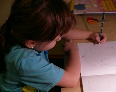 V tomto období byla opakovací cvičení pro předškoláky. Kreslení rovných čar ve směru šipky, dokreslení paprsků sluníčku, kreslení šikmých čar. Hanička už si sama více hlídá držení tužky a snaží se u stolu správně sedět. Občas se jí totiž stává, že má hodně skloněnou hlavu.