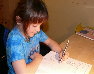 Je velmi dobré, když si Hanička už sama opravuje sezení a držení tužky při psaní. Je vidět, že i sama nad tím přemýšlí, a to je moc dobře.