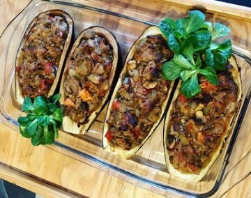 Recept na zapečený lilek s mletým masem, hnědými žampiony a cherry rajčátky