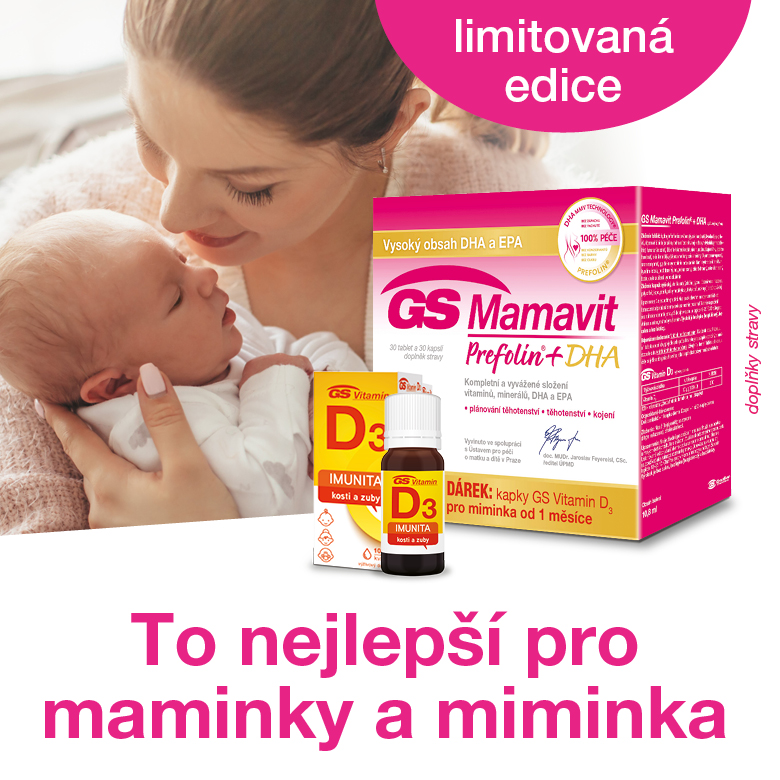 GS Mamavit Prefolin+DHA je nyní k dostání v limitované edici s dárkem – kapkami GS Vitamin D3, které jsou vhodné pro miminka již od 1 měsíce! Forma kapek navíc představuje komfortní podání nejmenším dětem.