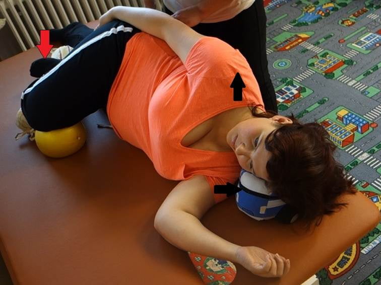 V poloze na boku je noha v prodloužení, podložená krční páteř, aby nepadala do ramene. Uvolněná horní ruka. Pod vrchní nohou je balónek. Hlavně neležet v těhotenství tak, aby nám noha padala do vnitřní rotace. Cvik spočívá v tom, že se s nádechem tlačí do balónku, ale netlačí koleno. Pohyb vychází z kyčle. Dojde ke sklopení pánve, protáhne se adukturová část nohy (přitahovače). Ve cviku vydržíme 15 sekund a povolíme. S nádechem pracuje pouze kyčel, zbytek leží volně. Opakujeme 6x na každou stranu. Cvik nesmí jít do krajních poloh, hrozí uskřípnutí miminka.