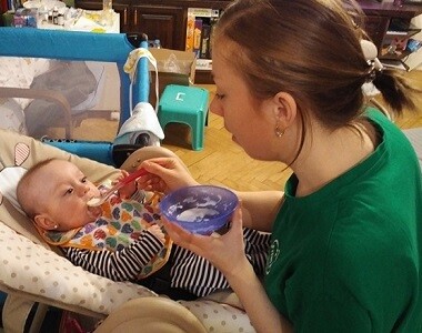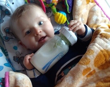 Monika měla trochu obavu, jak to bude s kojením, když začnou krmit i s pomocí láhve. Matyášek to nemá s láhví jednoduché, musí aktivně sát a namáha...