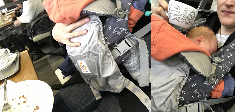 Jako další příležitost pro nošení jsem zvolila jeden trh nezávislé módy, kde se vždy v poměrně malém prostoru sejde mnoho lidí a s kočárkem bychom se proplétali jen těžko. Výhoda je tedy jasná. Protože syn byl teple oblečený a vevnitř by mu bylo horko, musela jsem mu sundat mikinu, což jsem opět nakonec zvládla bez nutnosti vyndání syna ven. Opět jsem jen více povolila popruhy, rozepla mikinu a bez problému ji sundala, pak jsem upravila popruhy zpět, což jde velmi snadno a mohli jsme se věnovat nakupování. Nakonec jsme zvládli i kávu v oblíbené kavárně. S nosítkem se totiž dá dobře i posadit, aniž by to bylo nepohodlné.