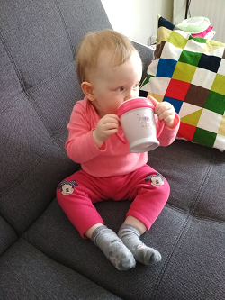 Po dalších dvou dnech zkoušení musím říct, že stále preferuje hrneček s brčkem. Hrneček od LOVI je asi ideálnější pro dítě, které ještě nemá jiný hrneček nebo hrneček s jiným principem. Věřím, že pro kojené děti je tento hrníček jako první ideální. Tekutina z něj nevytéká a spíš posiluje sací reflex. Ale dítě, které už má hrníček, ze kterého se snadněji pije, tento hrnek těžko přijme. Ale neházím flintu do žita a budeme zkoušet dál.