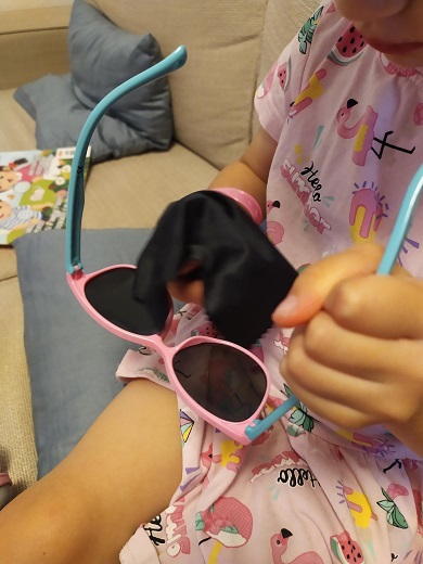 Když bych tedy shrnula vše výše napsané, hlavní výhody brýlí určitě spatřuji v krásných barvách a dokonalé ochraně před sluncem. Skvělý na brýlích je použitý materiál, který vypadá jako obyčejný plast, ale přitom je měkký a tím pádem poddajný a pružný. Velký úspěch u nás mělo pouzdro s hadříkem, Klárka ho má moc ráda a já oceňuji, že je brýle kam uklidit a nerozbijí se. Za negativum brýlí bych označila snad jen šňůrku, kterou jsme z výše popsaných důvodů nevyužili, nicméně šňůrka jde snadno oddělat, a proto je pro každého jednoduše volitelné, zda ji využije.