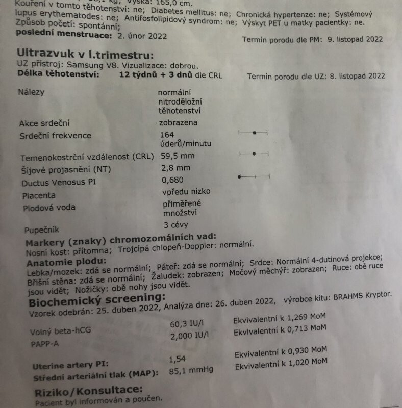 Dobry den, vyšel mi negativní screening, ale muj gynekolog mě chce poslat na tripltest z důvodu vysokého HCG. Hodnoty:věk 34, váha 120kg, CRL 71mm,NT 2.40mm,BPD 22.5mm,pupeční 3 cévy, nosní kost přítomna,trojcipa chlop.normalni, beta HCG 3.946MoM,PAPP-A 2.256MoM,PIGF 1.241MoM,Triz.21 1:3503,Triz.18a13 1:20000, preeklamp 1:300,rust.resrtrikce 1:1614, termín porodu 8.6.2024. Myslíte, že je to nutné,když vyšel celkově screening negativní ? Četla jsem o falešně pozitivních výsledcích tripltestu. Nerada bych se z toho ztresovala, ale ráda bych názor i jiného gynekologa. Moc děkuji.