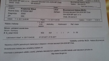 Dobrý den,mám za sebou samovolný potrat v 16tt. Po 1. Screeningu kde vše dopadlo dobře mi v noci praskla plodová voda a okamžitě jsem byla odvezena do nemocnice, kde byla provedena revize. Ve zprávě stojí, že plod byl v děloze na 3 části, z čehož usuzují, ze asi proběhla nějaká infekce. 4 hodiny po zákroku mě poslali domů i přes velké bolesti břicha na které mi daly jen asi 2 injekce proti bolesti…bolest odezněla asi za 2 dny a já se čistila asi 5 dní. Pak vše ustalo…na návštěvě u gynekologa mi byl objeven nějaký útvar nad vejcovody (víc mi neřekla, že mi vše poví až po výsledcích krve a pitevní zprávy z nemocnice) jenže já teď dostala menstruaci??? ( menstruační bolesti a poměrně silné krvácení) a dnes na krvi naměřeno HCG 3 492. Je to možné po 3 týdnech a 3 dnech od revize? Menstruace a takto vysoké hcg? Doktorka mi řekla jen čekejte ale ja začínám mít strach...moc děkuji za případné rady