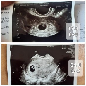Dobrý den paní doktorko, jsem momentálně těhotná (mám za sebou jedno zamlklé těhotenství, miminko je opravdu vymodlené). První ultrazvuk byl 17.8 (dle ms mělo být 6+3) a pan doktor v CAR vypočítal těhotenství na 6+0 s AS, což není nic zvláštního, protože vzhledem k PCOS mívám ovulaci opravdu později. Vzhledem k tomu, že pracuji v nemocnici a stal se mi tam takový malý úraz (uklouzla jsem) tak se mi hned pan doktor nabídl, že uděláme kontrolní ultrazvuk (tudíž jiný lékař, jiný ultraz.přístroj). Vyděšil mě když těhotenství vypočítal jen na 6+2 místo 7+0 (bylo to po týdnu). Akce srdeční byla stále..jen mám strach, že se opravdu začíná opožďovat ve vývoji a znovu mě potká zamlklé těhotenství. Přikládám foto z obou ultrazvuků. Připadá mi i laickým okem, že embryo rozhodně větší je. Je možné, že to pan doktor špatně změřl? nebo že každý přístroj měří jinak?Děkuji vám !