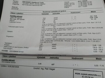 Dobrý den,v červnu 2019 jsem potratila (7+1). Od té doby se marně snažím znovu otěhotnět. Podotýkám, že mám již dvě zdravé, větší děti, počaty přirozenou cestou. Nyní se rok snažíme o třetí dítě a nedaří se. Na úpravu cyklu jsem brala 3 měsíce Gynorodyl. Nyní jsem bez jakýkoliv léků. Vždy se vše jevilo ok, ovulace atd.. poslední měsíc, dva se mému gynekologovi nezdál nález, čekal "lepší" těsně před předpokládanou ovulací, tak mi udělal vyšetření hormonů a nedopadlo to vůbec dobře. Vše v pořádku, jen AMH vyšel 0,45. Takže mi oznámil, že šance na otěhotnění přirozenou cestou je velice nízká. Stát se samozřejmě může. Umělé oplodnění, vzhledem k němuž věku (37) nedoporučil. Nevím, jestli loňské těhotenství byla náhoda, vzhledem ke špatným výsledkům, nebo hladina AMH hormonu tak rapidně klesla. Každopádně dítě si stále moc přeji, když se to nepodařilo za poslední rok přirozenou cestou, moc tomu nevěřím, že by se to ještě někdy podařilo. Když to řeknu narovinu, i čas nás tíží. Manželovi je 47 let. Dítě chce, ale chce to nechat přírodě, prý to přijde samo. Já tomu ale už nevěřím. Ve středu by měl jít na spermiogram, ale to jsme ještě neznali výsledky mých hormonů. Jaká je šance otěhotnět ISCI či jinou metodou? Lze vůbec odebrat mé vajíčka při takových hodnotách?Budu moc ráda, když mi napíšete, aspoň si trochu urovnám informace a třeba to taky může být poslední impulz k tomu to úplně vzdát... když "už mám přece dvě zdravé děti".DěkujiS pozdravemKepáková