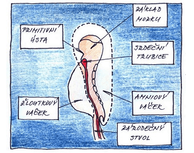 Obrázek 1: Zárodek v polovině 4. týdne. Celý válcovitý zárodek je již uložený v amniovém váčku a obklopený amniovou tekutinou (plodovou vodou). Amniový váček se začíná přetahovat přes zárodečný stvol a stopku žloutkového váčku a spojí je nakonec v jednotný pupečník.