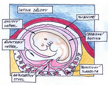 Délka zárodku se pohybuje na konci čtvrtého týdne od oplození mezi 6 – 8 mm. Zárodek je spolu se svými obaly nejčastěji uložen ve sliznici zadní stěny dělohy. Na povrchu sliznice vytváří dobře patrné vyklenutí (obr. 3).