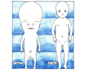 Obrázek 3: Schematické znázornění základů zevních pohlavních orgánů. Podle vzhledu těchto základů nepoznáme, jestli se narodí holčička nebo chlapeček, první základy jsou totiž u obou pohlaví stejné.